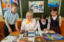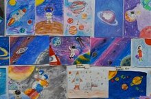 Из работ обучающихся начальных классов педагог-организатор Даминова О. А. оформила выставку рисунков, посвящённую планетам, звёздам и полётам человека в космос.