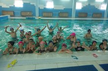 День бассейна в 33 школе. Ребята пришкольного лагеря окунулись в мир Нептуна. Тренер с ними проводил гимнастику и водные игры.