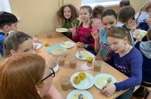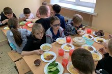 Мы за столиком сидим вкусный завтрак мы едим. Постарались повара, приготовили с утра нам омлет и запеканки. Кашу вкусную из манки. И конечно молочка, целых два стаканчика. Завтрак быстро уплетём, на занятия пойдем. Но сначала мы конечно, всю посуду уберём. 01.06.2021