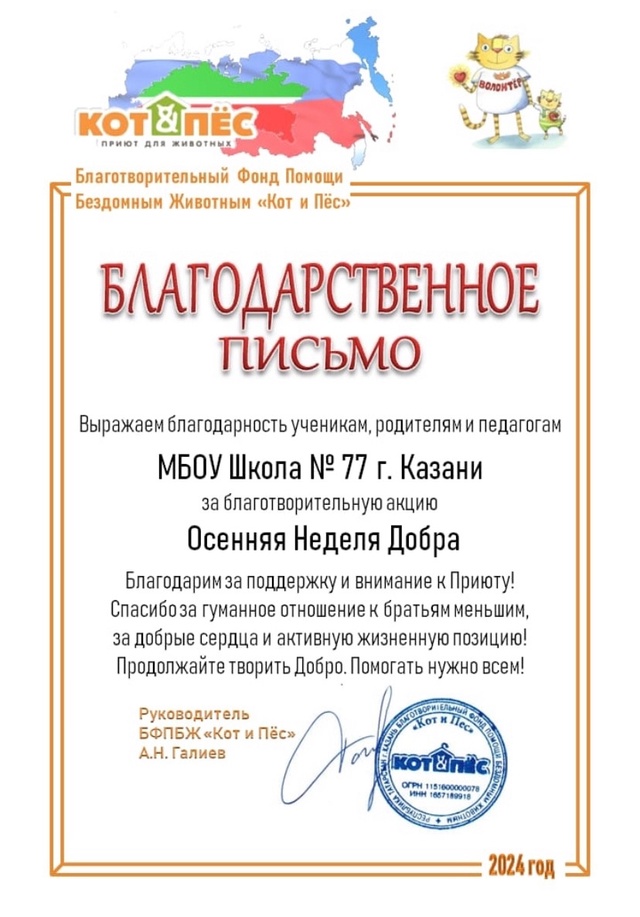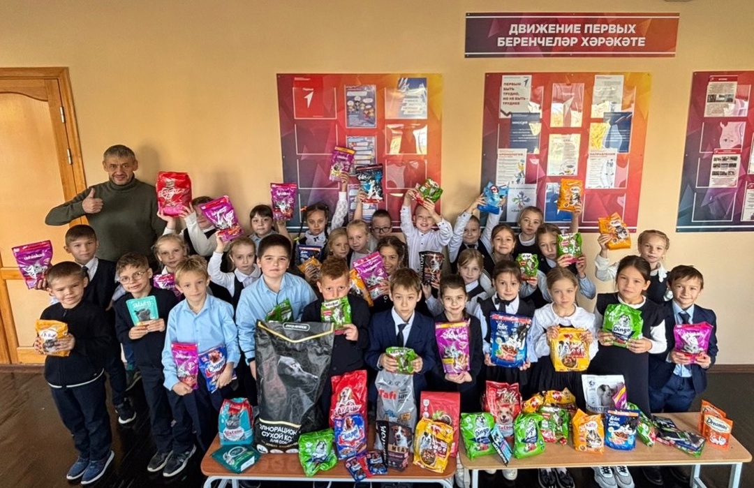 В рамках Осенней Недели Добра активисты ШУС и Движения Первых закупили корма для животных в приют «Кот и Пёс». Руководитель приюта Альберт Галиев приехал в школу и провёл для ребят Уроки Добра. Скоро наступят холодные осенние дни и братьям нашим меньшим нужна помощь. Покормите бездомных животных, помогите им приобрести семью и добрых хозяев.