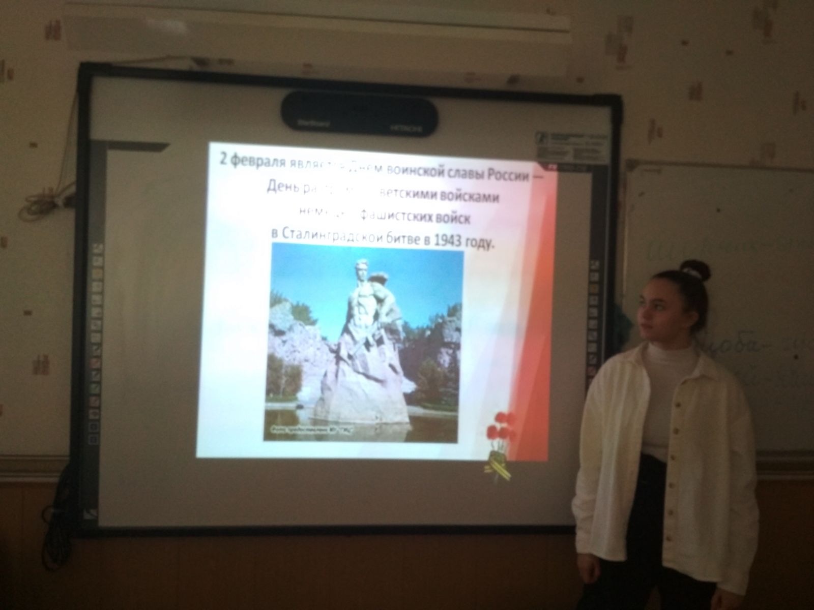 2 февраля отмечается День воинской славы России — День разгрома советскими войсками немецко-фашистских войск в Сталинградской битве (1943), установленный в соответствии с Федеральным законом от 13 марта 1995 года "О днях воинской славы и памятных датах России". В нашей школе прошли внеклассные мероприятия посвященные Дню воинской славы.