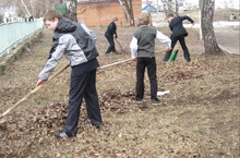Сегодня учащиеся 5 - 11 классов вышли на уборку территории. Убирали прошлогодние листья и раскидывали оставшийся снег.