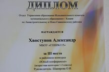 Поздравляем Хвостунова Александра, ученика 1а класса, который занял III место в районном конкурсе "Юный конферансье". Возрастная категория 1-2 классы. Руководитель Шакирова О.И. Желаем дальнейших успехов!