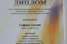 Поздравляем Сафину Азалию, ученицу 8а класса, которая была награждена дипломом за I место в районном конкурсе "Юный конферансье". Возрастная категория 7-8 классы. Руководитель Файзрахманова Ф.Р.