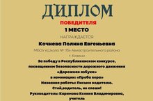 Поздравляем Кочневу Полину, ученицу 5б класса, занявшую 1 место в Республиканском конкурсе, посвящённом безопасности дорожного движения "Дорожная азбука" в номинации "Проба пера". Название работы: "Письмо водителю. Стой, водитель, не спеши!" Руководитель: Каримова К.В.