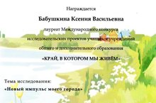 Ученица 8 а класса Бабушкина Ксения стала лауреатом Международного конкурса исследовательских проектов "Край, в котором мы живем" в секции "Современный облик родного края". Поздравляем Ксению и Павлову Альбину Николаевну, подготовившую Ксению для участия в этом конкурсе и желаем дальнейших успехов.