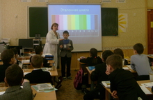 Сегодня в школе № 60 Авиастроительного района наша участница конкурса "Учитель года 2013" Пашагина Елена Владимировна провела урок окружающего мира по теме "Экологическая безопасность" и час общения с учащимися 3 класса на тему: "Край, в котором хочу жить я". Дети были вовлечены в исследовательсую работу, рассматривали факторы влияния на экологию, находили пути решения многих экологических проблем. В результате общения построили "дерево добра", листьями которого стали обещания детей о выполнении доброго дела для улучшения родного края. Ученикам очень понравилось, надеемся, что и жюри тоже. Елене Владимировне пожелаем вдохновения для участия в следующих этапах конкурса и удачи!