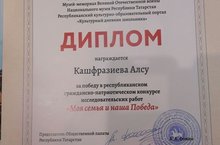 Поздравляем ученицу 4 класса МБОУ «ООШ № 168» Кашфразиеву Алсу, ставшую победителем республиканского гражданско-патриотического конкурса исследовательских работ «Моя семья и наша Победа»!
