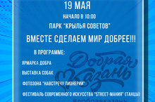 19 мая в 10.00 в парке «Крылья Советов» состоится благотворительная ярмарка «Вместе сделаем мир добрее!!!» В программе : ярмарка добра, выставка собак, фотозона «Навстречу пионерии», чемпионат по лазертаку и многое-многое другое.