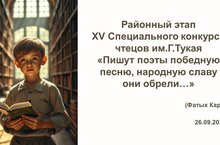 26.09.2025 г. был проведен районный этап XV Специального конкурса чтецов им.Г.Тукая «Пишут поэты победную песню, народную славу они обрели...». В конкурсе приняли участие 17 конкурсантов из образовательных учреждений Авиастроительного района: ЦВР; шк.№147, 115, 60; лиц.№26, 145; гим.№10, 33, 36, 14. По решению жюри места распределились следующим образом: