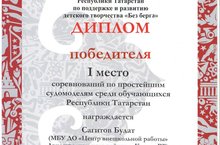 Сагитов Булат - учащийся объединения «Техническое творчество» педагог Идиятов И.И. занял I место в Республиканских соревнованиях по простейшим судомоделям в рамках Фестиваля муниципальных образований РТ по поддержке и развитию детского творчества.