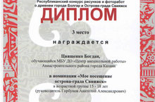 Цвященко Богдан – учащийся объединения «Фото-видео студия «Кадр» педагог Горбунов А.А. занял III место в Республиканском конкурсе рисунков и фоторабот о древнем городе Болгар и Острове-граде Свияжск.