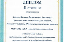 Проект «Мой выбор» был отмечен Дипломом второй степени Управления образования г. Казани. Также был вручен сертификат, подтверждающий факт включения данного проекта в реестр инновационных разработок города Казани.