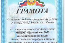Грамота от ОГИБДД УМВД 26.01.2017 Отделение по Авиастроительному району ОГИБДД УМВД России по г. Казани наградило грамотой педагогический коллектив МБДОУ "Детский сад № 22 комбинированного вида" за активное участие в конкурсе рисунков "Безопасный путь домой" Выражаем благодарность родителям и воспитанникам принявших активное участие в конкурсе.