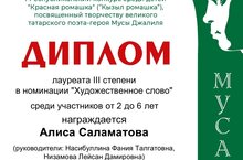 Поздравляем наших участников Республиканского конкурса среди детей посвященного творчеству великого татарского поэта-героя М. Джалиля "Красная ромашка", воспитателя Лейсан Дамировну и воспитанницу старшей группы Саламатову Алису с 3 местом в номинации "Художественное слово". Желаем дальнейших успехов!