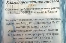 Выражает благодарность педагогическому коллективу МБДОУ "Детский сад № 123" за активное участие в конкурсе рисунков среди воспитанников ДОО города Казани "Безопасный путь домой".