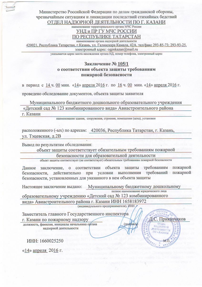 Заключение о соответствии требованиям пожарной безопасности МБДОУ № 123