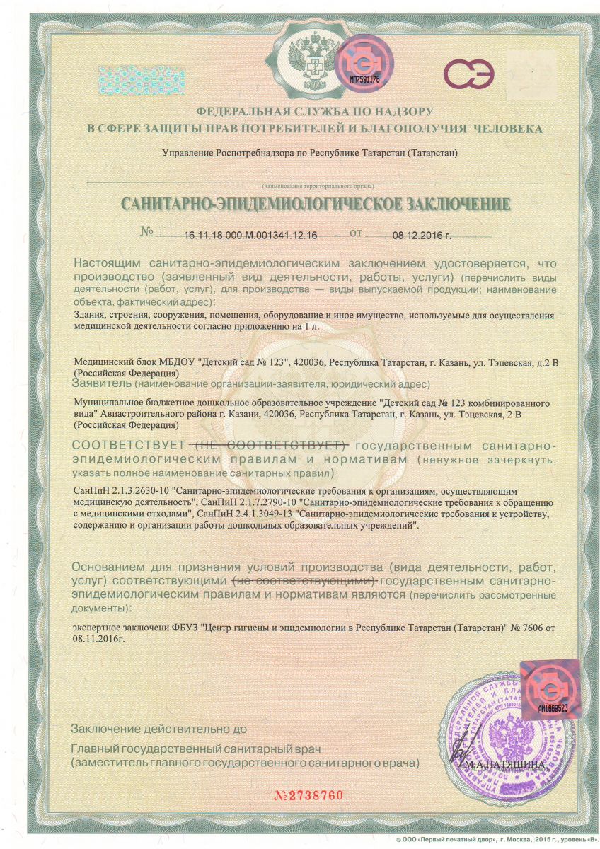 Санитарно-эпидемиологическое заключение на осуществление мед.деятельности МБДОУ № 123