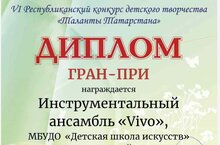 Инструментальный ансамбль «Vivo» (руководитель: Абросимова И.В., концертмейстер: Бурова В.В.) завоевал Гран-При VI Республиканского конкурса детского творчества «Таланты Татарстана».
