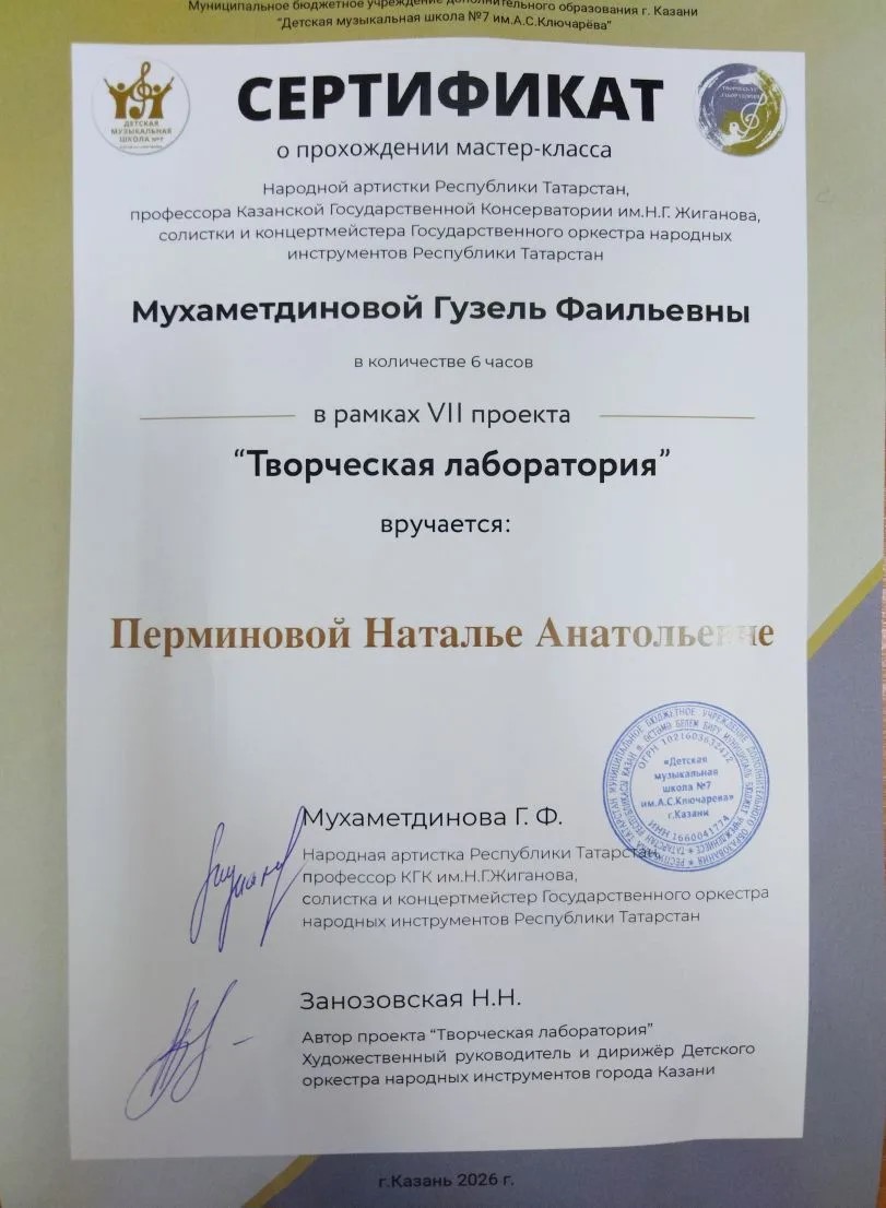 2. Городское методическое объединение преподавателей струнно-щипковых инструментов ДМШ и ДШИ г. Казани, участие в Мастер-классе преподавателя ДМШ № 17 Давлетшина А.Ф., Перминова Н.А., Сертификат, 08.10.2025г.;