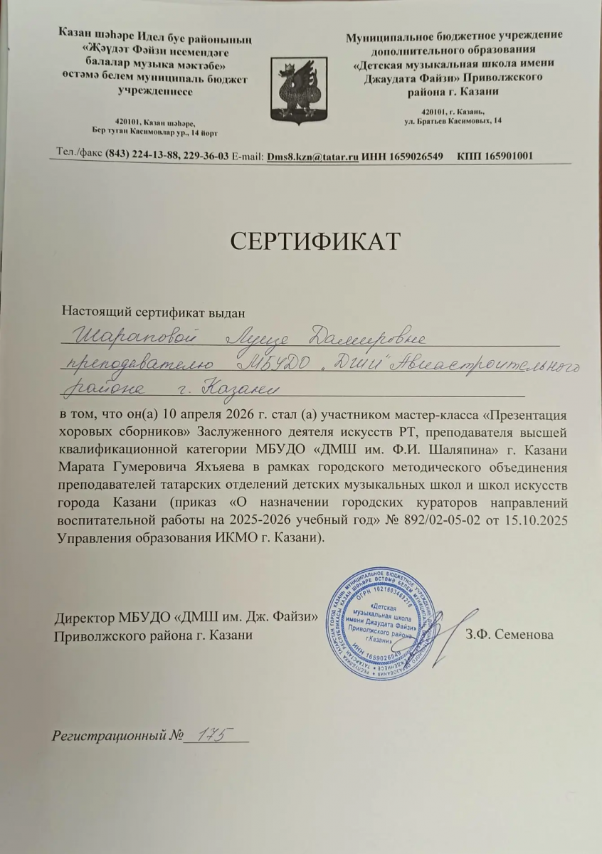 24. Мастер-класс "Презентация хоровых сборников" Заслуженного деятеля искусств РТ, преподавателя высшей квалификационной категории МБУ ДО "ДМШ им.Ф.И.Шаляпина" М.Г.Яхъяева , Сертификат, Шарапова Л.Д., 2026г.