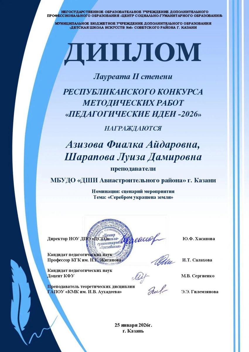 16. Республиканский конкурс педагогических работ "Педагогические идеи-2026", сценарий мероприятия "Серебром украшена земля", Азизова Ф.А., Шарапова Л.Д., Лауреат 2 степени, 2026г.;