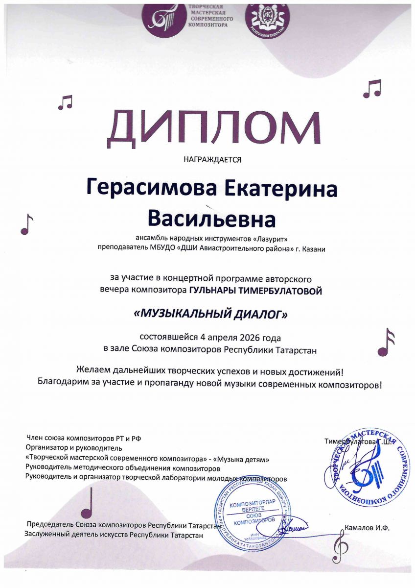 16. Авторский вечер композитора Г.Тимербулатовой "Музыкальный диалог" в зале союза композиторов РТ, Диплом, Герасимова Е.В., 2026г.