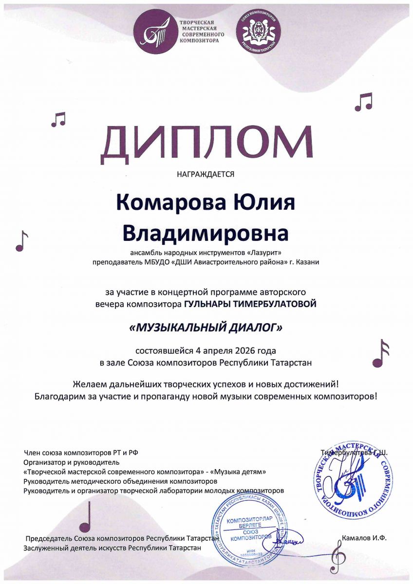 15.Авторский вечер композитора Г.Тимербулатовой "Музыкальный диалог" в зале союза композиторов РТ, Диплом, Комарова Ю.В., 2026г.