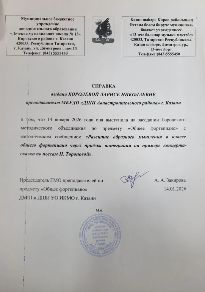 9. Городское методическое объединение по предмету "Обшее фортепиано", методическое сообщение "Развитие образного мышления в классе общего фортепиано через приемы интеграции на примере концерта-сказки Н.Тороповой", Королева Л.Н., Справка, 2026г.;