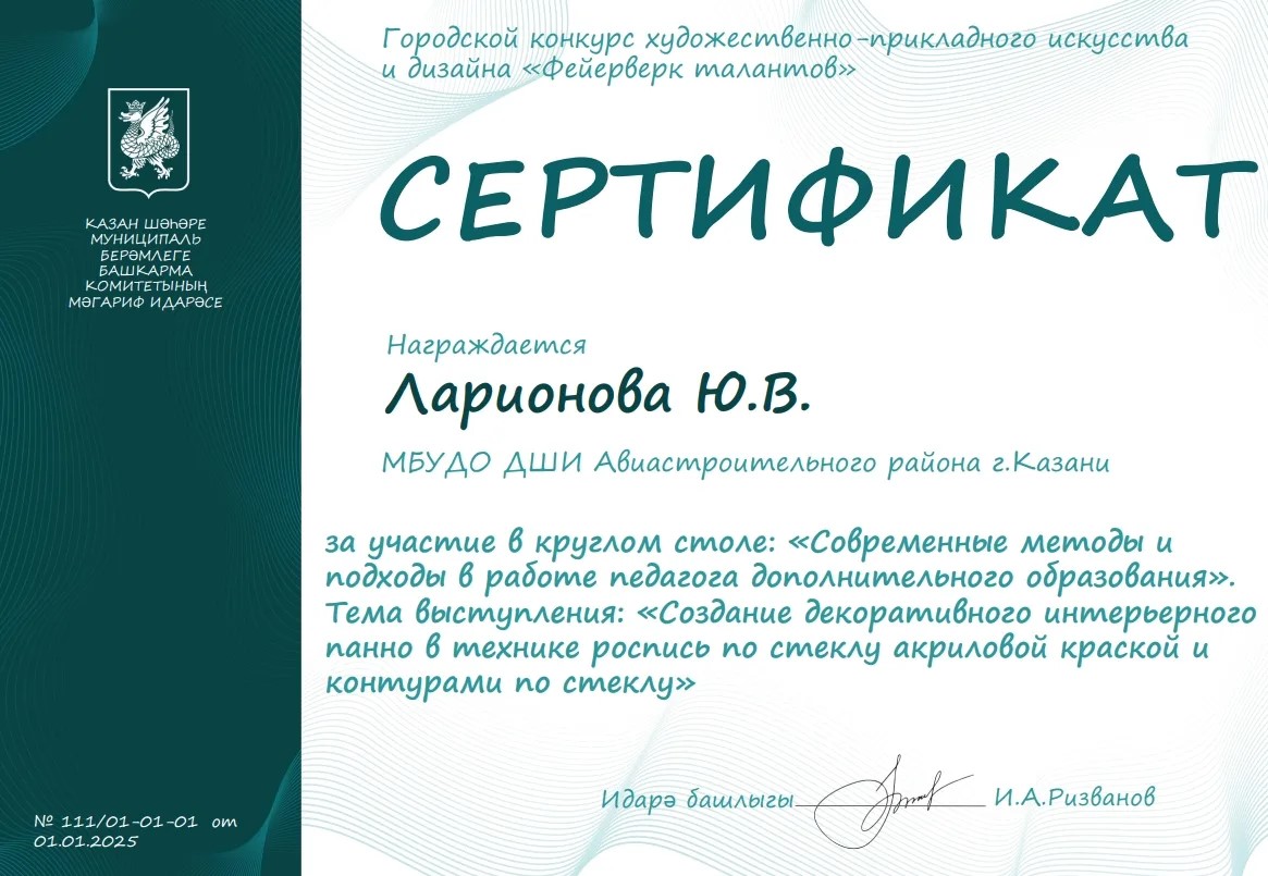 10. Круглый стол "Современные методы и подходы в работе педагога дополнительного образования". Тема выступления: "Создание декоративного интерьерного панно в технике роспись по стеклу акриловой краской и контур по стеклу" в рамках Городского конкурса художественно-прикладного искусства и дизайна "Фейерверк талантов", Сертификат, Ларионова Ю.В., 2026г.;