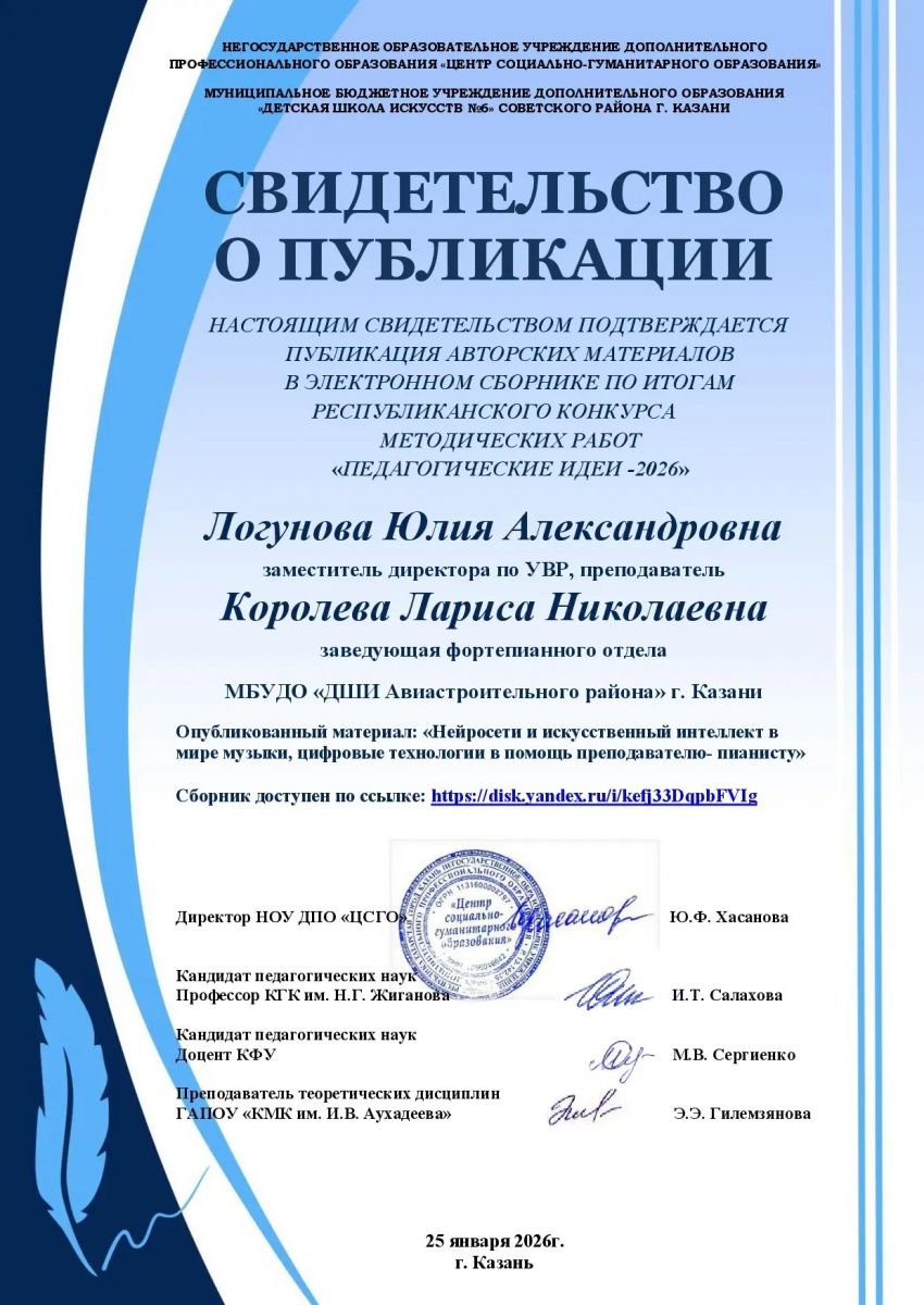 19. Республиканский конкурс педагогических работ "Педагогические идеи-2026", методическое сообщение "Нейросети и искусственный интеллект в мире музыки, цифровые технологии в помощь преподавателю-пианисту", Логунова Ю.А., Королева Л.Н., Публикация, 2026г.;