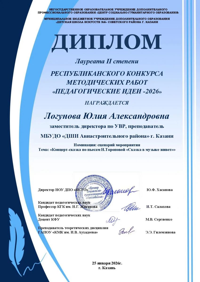 15. Республиканский конкурс педагогических работ "Педагогические идеи-2026", сценарий мероприятия "Концерт-сказка по пьесам Н.Тороповой "Сказка в музыке живет"", Логунова Ю.А., Лауреат 2 степени, 2026г.;