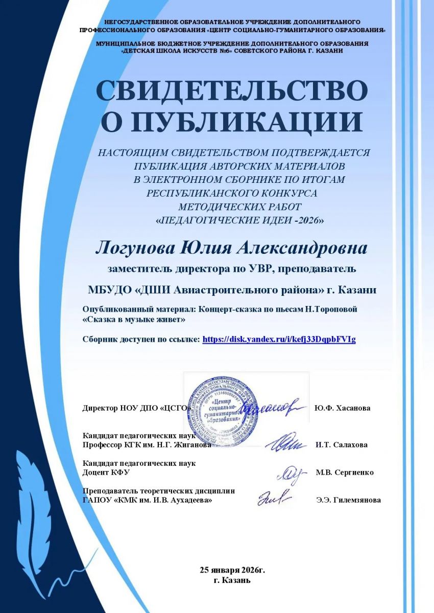 13. Республиканский конкурс методических работ "Педагогические идеи - 2025", Публикация "Концерт-фантазия по мотивам сюиты К.Сен-Санса "Карнавал животных", 27.01.2025г., Логунова Ю.А.;
