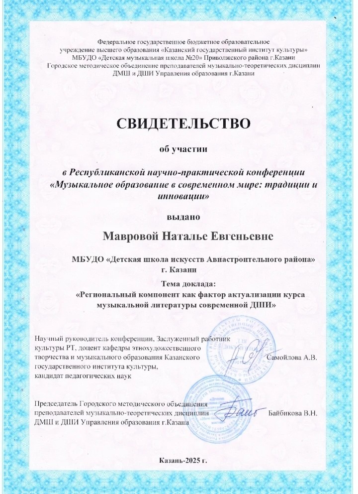 12. Республиканская научно-практическая конференция "Музыкальное образование в современном мире: традиции и инновации", доклад "Региональный компонент как фактор актуализации курса музыкальной литературы современной ДШИ", Свидетельство, Маврова Н.Е., 2025г.;
