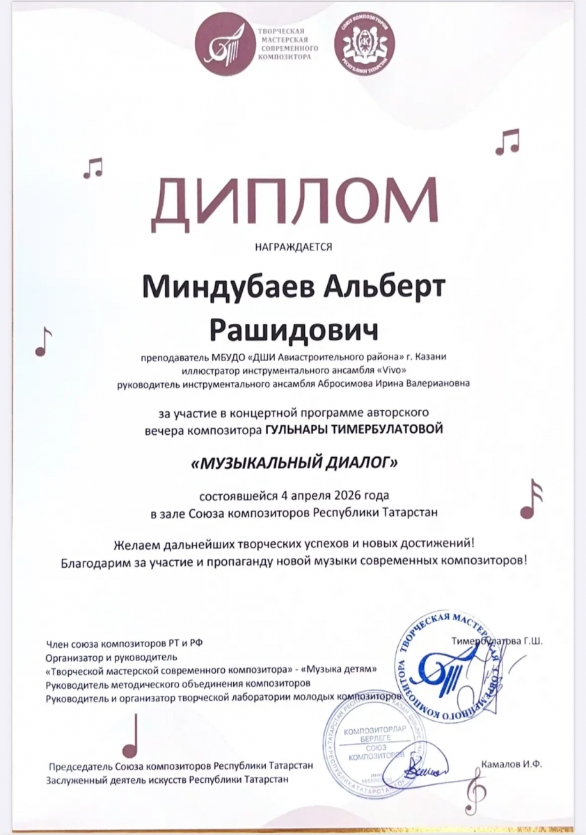 19.Авторский вечер композитора Г.Тимербулатовой "Музыкальный диалог" в зале союза композиторов РТ, Диплом, Миндубаев А.Р., 2026г.