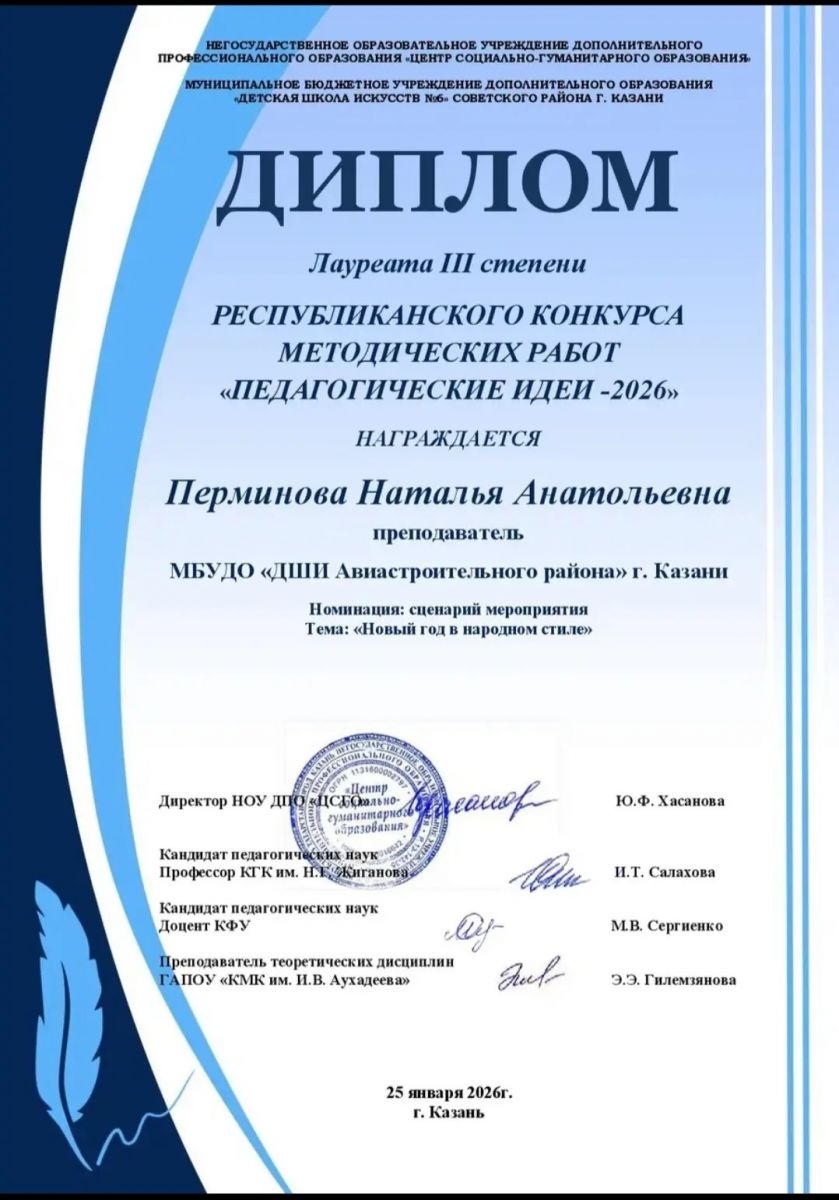 17. Республиканский конкурс педагогических работ "Педагогические идеи-2026", сценарий мероприятия "Новый год в народном стиле", Перминова Н.А., Лауреат 3 степени, 2026г.;