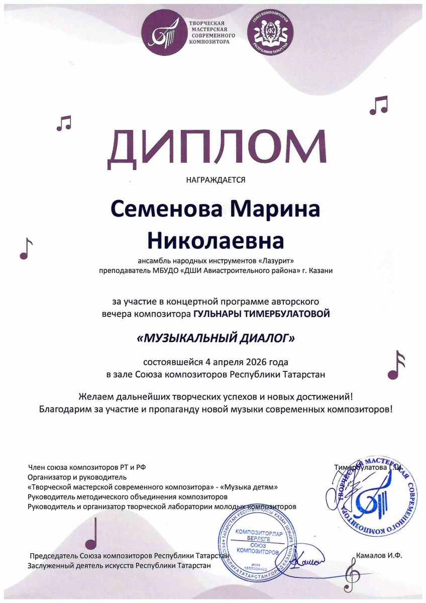 12.Авторский вечер композитора Г.Тимербулатовой "Музыкальный диалог" в зале союза композиторов РТ, Диплом, Семёнова М.Н., 2026г.