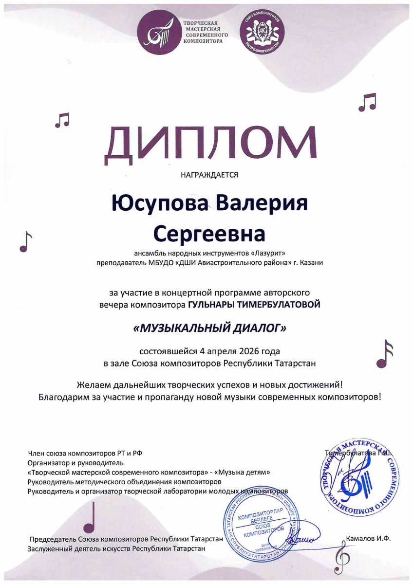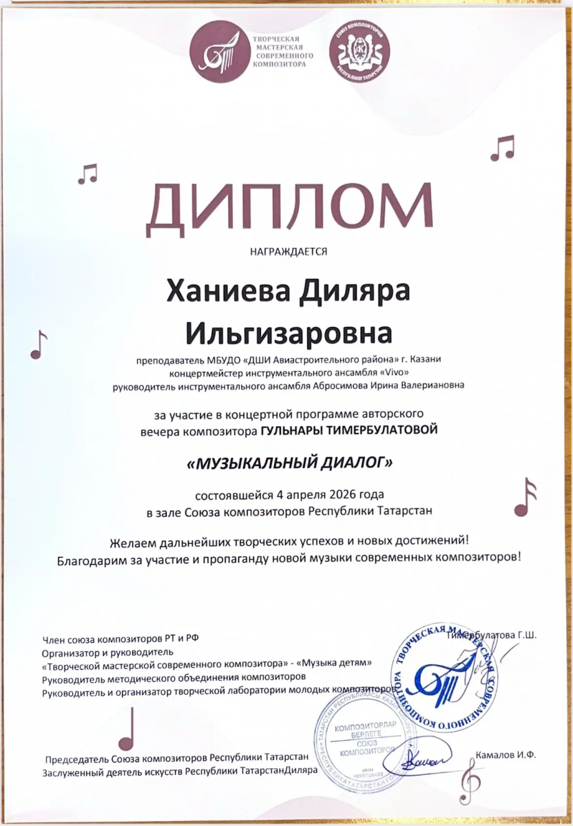 17.Авторский вечер композитора Г.Тимербулатовой "Музыкальный диалог" в зале союза композиторов РТ, Диплом, Абросимовой И.В., 2026г., 18. Авторский вечер композитора Г.Тимербулатовой "Музыкальный диалог" в зале союза композиторов РТ, Диплом, Ханиева Д.И., 2026г.
