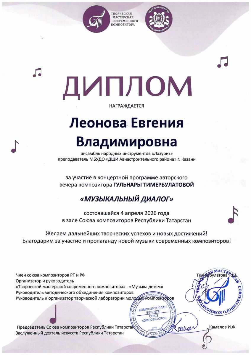 11. Авторский вечер композитора Г.Тимербулатовой "Музыкальный диалог" в зале союза композиторов РТ, Диплом, Леонова Е.В., 2026г.