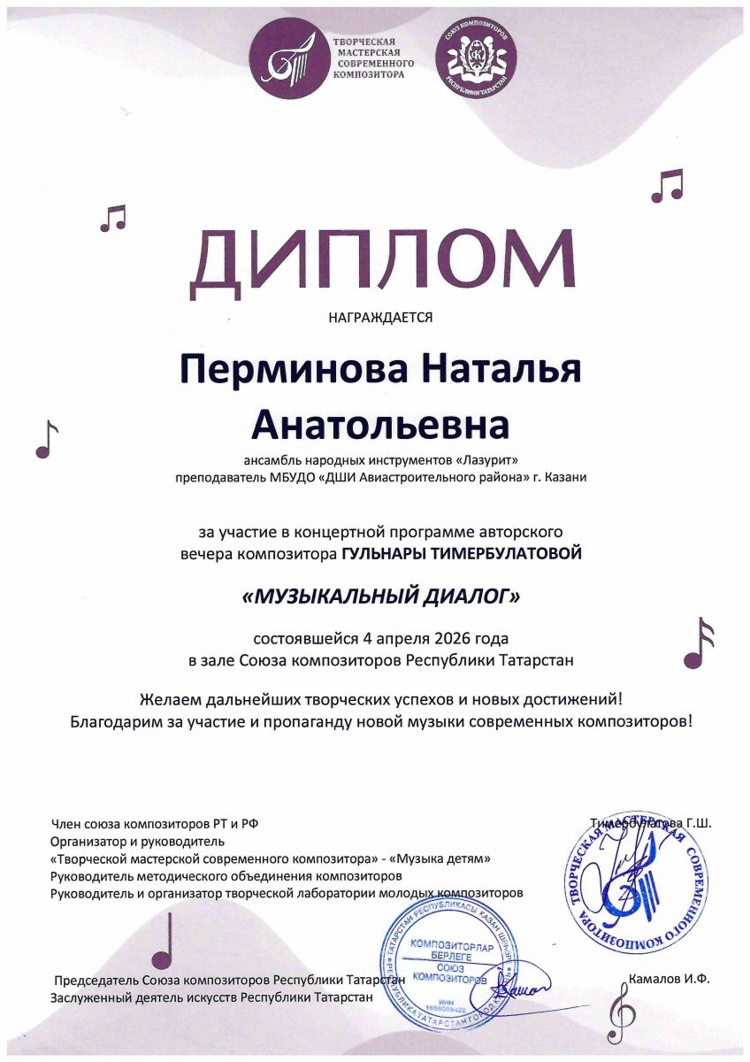 14. Авторский вечер композитора Г.Тимербулатовой "Музыкальный диалог" в зале союза композиторов РТ, Диплом, Перминова Н.А., 2026г.