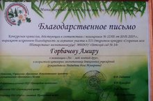Воспитаннику нашего детского сада Горбачеву Амиру вручили благодарственное письмо за активное участие в XII Открытом конкурсе "Сохраним леса Татарстана" в номинации "Лес - зеленый друг"