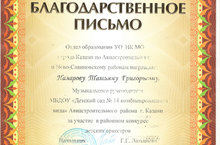 Отдел образования УО ИК МО города Казани по Авиастроительному району наградил благодарственным письмом Назарову Татьяну Григорьевну за участие в районном конкурсе детских оркестров.
