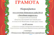 Поздравляем коллектив Детского сада №14 за III место в городском конкурсе театральных постановок среди педагогических коллективов образовательных учреждений с театральной постановкой «Девушки. Последний счастливый день» по повести Б.Г.Васильева «А зори здесь тихие».