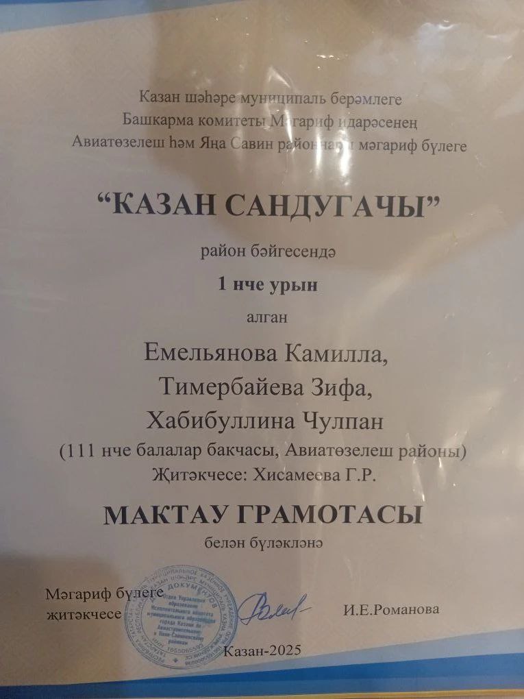 Поздравляем наших воспитанниц Емельянову Камиллу, Тимербайеву Зифу, Хабибуллину Чулпан и педагога Хисамиеву Гульназ Рафаэлевну с заслуженным 1 местом в районном этапе городского конкурса " Казан сандугачы ". Желаем дальнейших побед!