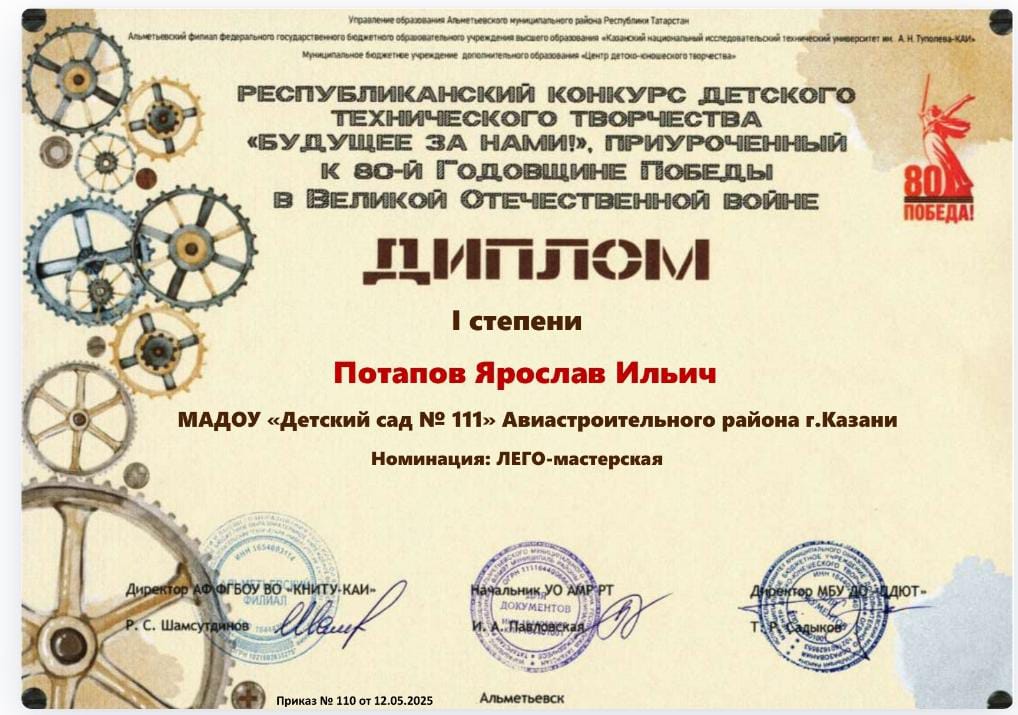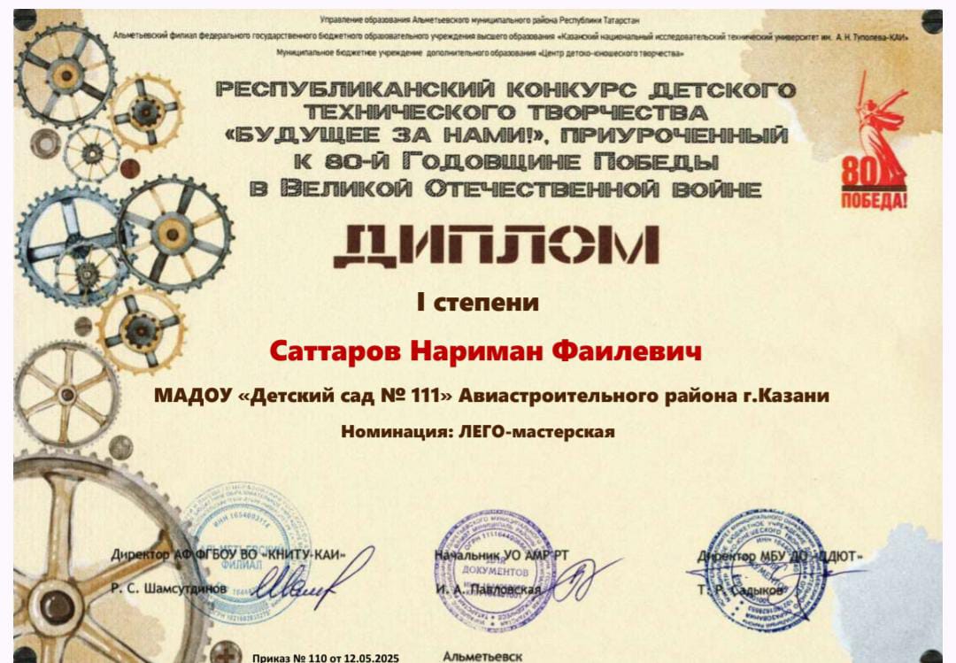 Воспитанники 9 группы Саттаров Нариман и Потапов Ярослав приняли участие в Республиканском конкурсе детского технического творчества " Будущее за нами ", приуроченный к 80 - й Годовщине Победы в Великой Отечественной войне и получили дипломы 1 степени в номинации "Лего - мастерская".