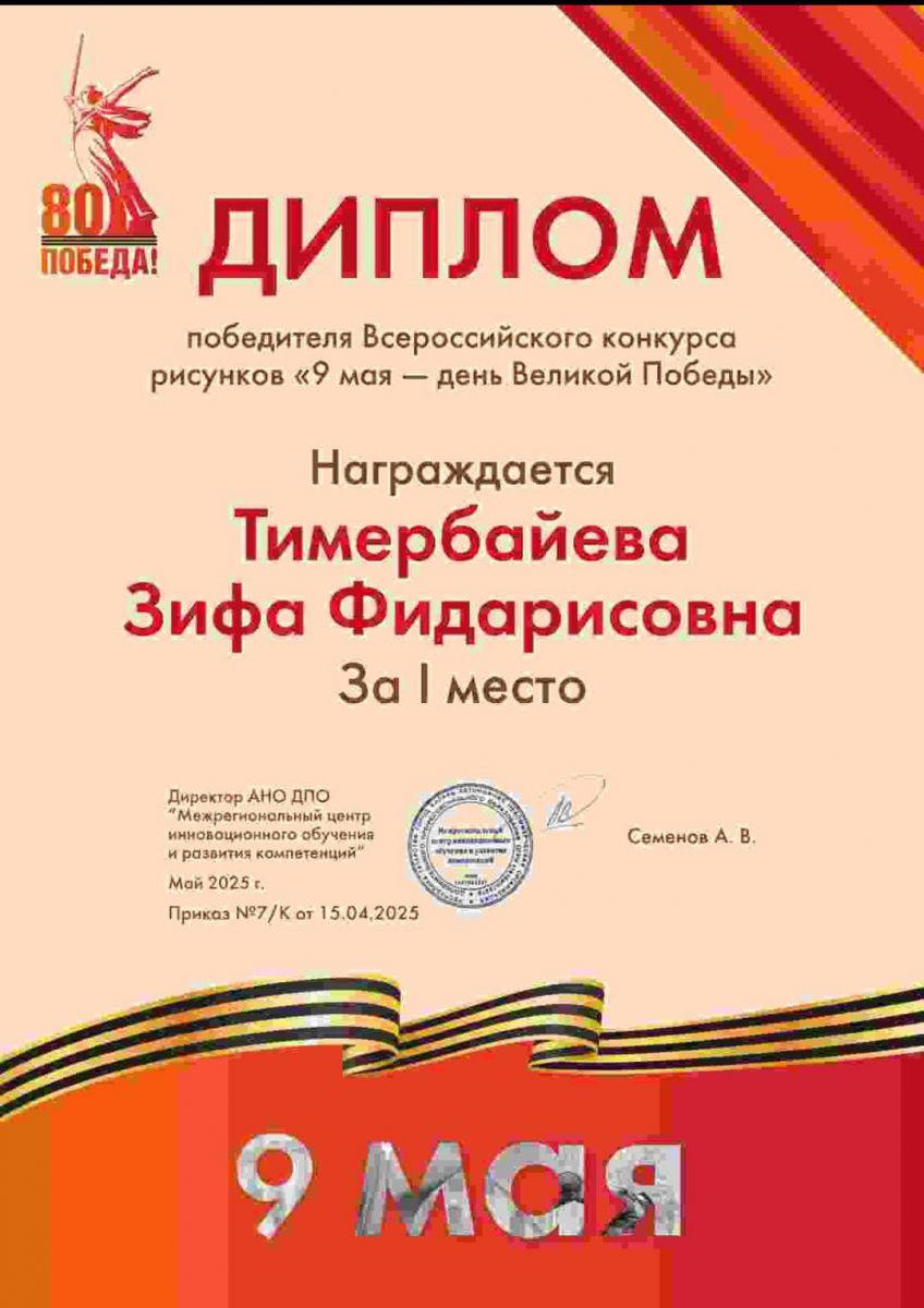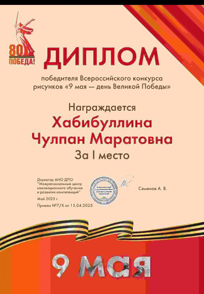 Воспитанники 9 группы Хабибуллина Чулпан и Тимербайева Зифа по руководством нашего педагога Гущиной Елены Николаевны приняли участие во Всероссийском конкурсе рисунков и были награждены дипломами победителя за 1 место. Поздравляем!