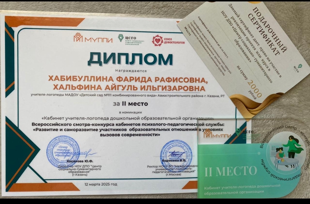 Наши учителя-логопеды заняли 2 место во Всероссийском смотре-конкурсе кабинетов психолого-педагогической службы: «Развитие и саморазвитие участников образовательных отношений в условиях вызовов современности». Поздравляем Фариду Рафисовну и Айгуль Ильгизаровну с победой и желаем дальнейших профессиональных успехов!