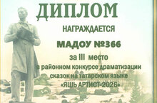 Поздравляем с заслуженной победой, детский коллектив нашего детского сада, в районном конкурсе драматизации сказок на татарском языке " Яшь артист -2026". Руководители: Ахметзянова Разина Зуфаровна, Гизатуллина Гулина Шамилевна.