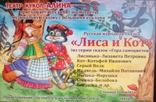 Театр кукол "Алина" приглашает всех ребят посмотреть музыкальную сказку с большими куклами "Лиса и Кот"! 16.04.2018