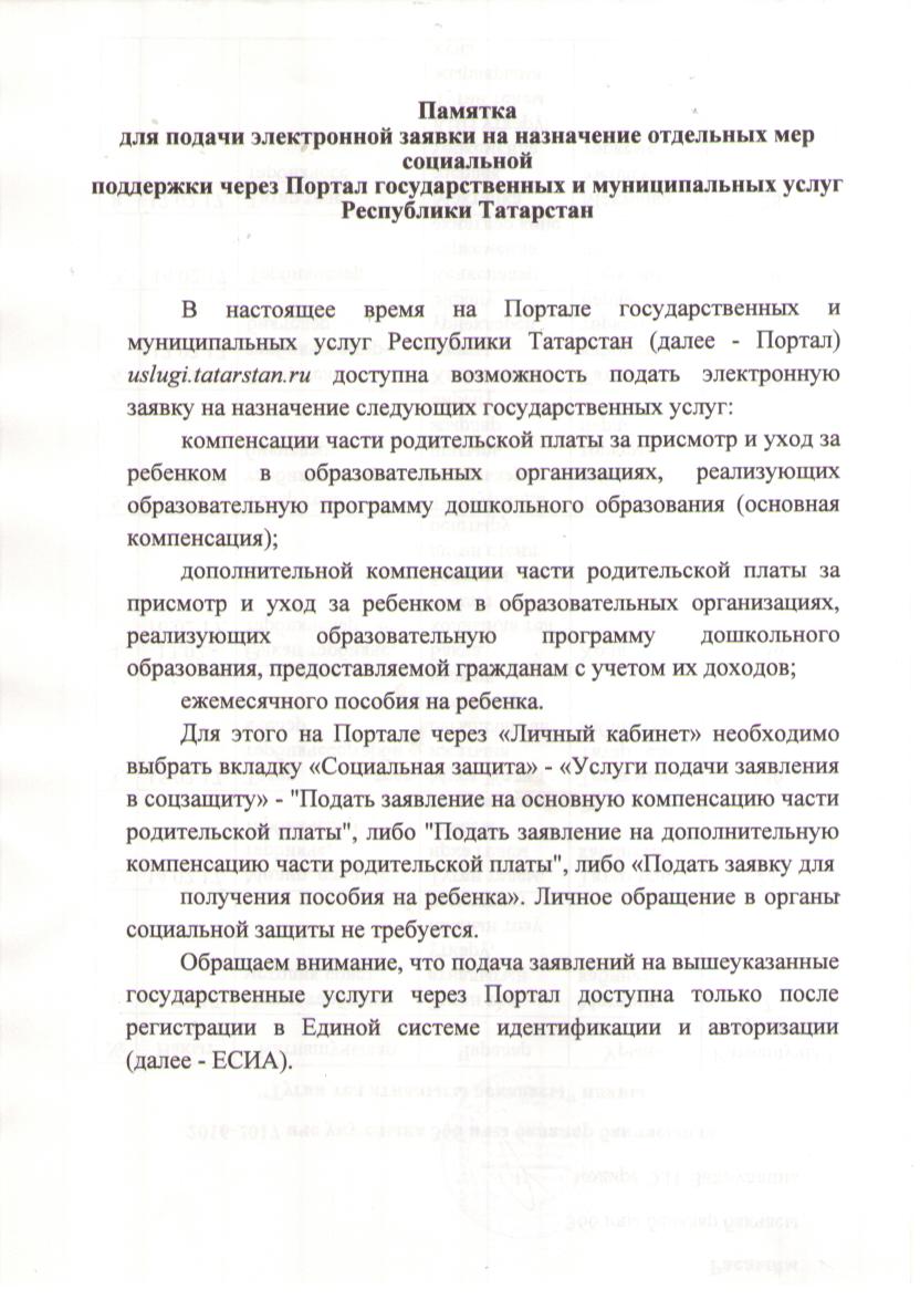 Вы можете ознакомиться с памяткой для подачи электронной заявки на назначение отдельных мер социальной поддержки через Портал государственных и муниципальных услуг РТ, пройдя по ссылке ПАМЯТКА